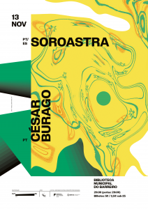 13 Novembro 21h30 (portas: 21h00) Biblioteca Municipal do Barreiro Bilhetes: 5€ / 2,5€ sub-25 SOROASTRA Filhos do confinamento de 2020, os Soroastra traduzem a colaboração e a “aliança ibérica” há muito pressentida entre Afonso Simões (bateria e percussão) e Borja Caro (Max-Msp, sintetizadores, efeitos); as afinidades entre os dois músicos revelam-se, em estúdio, por planícies de krautrock e de toda a electrónica dos anos 80 em diante - a new age, o tribalismo, o tecno -, e reflectem…