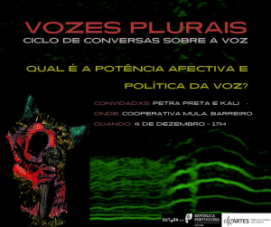 “Vozes Plurais” é um ciclo de conversas abertas ao público sobre a potência afetiva e política da voz nas suas várias manifestações, seja na música, na oralidade ou na escrita. As pessoas convidadas para este primeiro encontro são a Sara Graça (Petra Preta) e o Kali (Passaru Macaco). Apresentando também as suas almas hyper-criativas, iremos estar à conversa sobre a presença e influência da voz nos nossos corpos. Como é que a voz é importante nas nossas vidas? Existe uma…