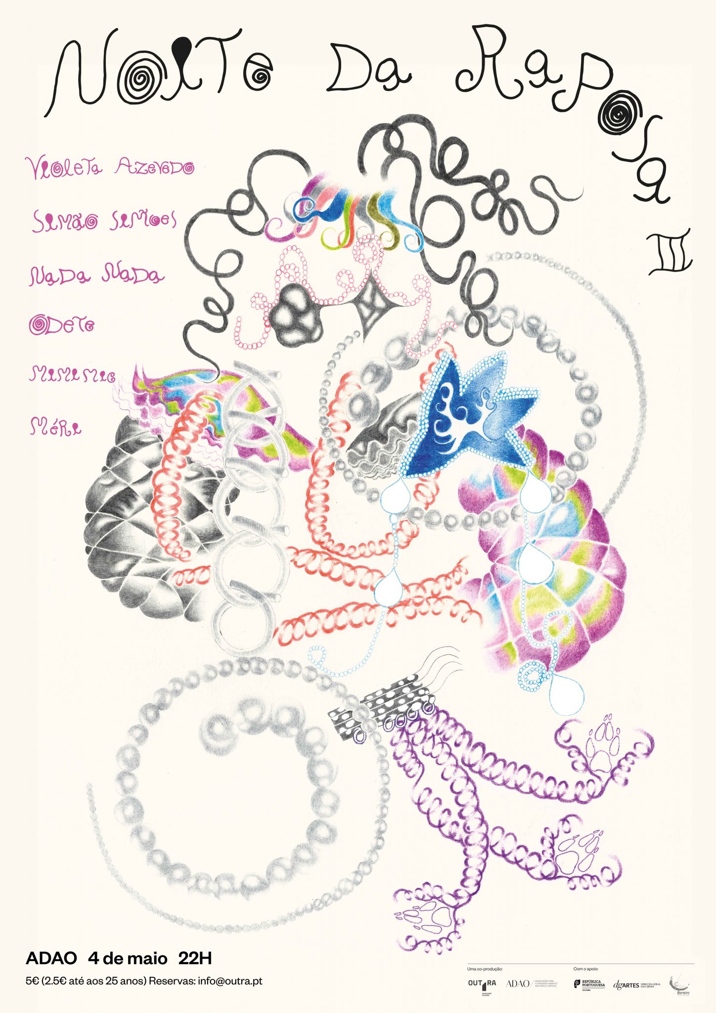 MIMIMIC é o alter-ego do Diogo Carneiro, a desbravar caminhos pelo psicadelismo electrónico colorido; VIOLETA AZEVEDO é um enorme talento de Lisboa a criar mundos impossíveis com uma flauta processada; MÉRI é membro integrante da barreirense Linha Amarela com o bom gosto e pausa associados a este grupo de jovens guerrilheiros suburbanos; ODETE é uma das vozes mais activas e fortes da heterogénea cena dançante nacional, em regresso ao Barreiro após actuar no OUT.FEST 2018; SIMÃO SIMÕES é figura de proa da nova geração de músicas electrónicas oblíquas no país com epicentro no colectivo e editora Rotten/Fresh; NADA-NADA é o veículo solo do multi-talentado Cláudio Fernandes (Pista, Debut, etc) a fazer música que combina com as camisas de padrões tropicais no novo milénio.